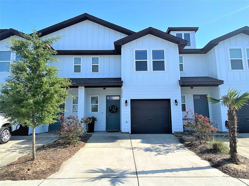 Beautiful 3bed/2.5bath townhome in the peaceful Spyglass community! This unit is located on the pond making for gorgeous views from the private back patio. The entrance of the townhome is connected by a long foyer to the half bath and spacious open floor plan holding the kitchen, dining, and living space; the main floor has luxury vinyl flooring throughout, tall 9' ceilings, conveying stainless, attached single garage, steel kitchen appliances, and granite kitchen countertops. Partially fenced back patio overlooking the pond is just off the living space. The 3 bedrooms, 2 bathrooms, laundry closet, and extra storage closets are located on the fully-carpeted second floor (other than LVP bathrooms). The primary suite holds a large walk-in closet, walk-in shower, double vanity with granite countertops, and linen closet. Residents of the Spyglass community can enjoy the community pool and pond with path. Also, take advantage of the convenient location- within a mile of lots of restaurants, the Orange Beach Elementary School, the Orange Beach Rec Center, Library, and more; just 3 miles from the Cotton Bayou Beach on the Gulf of Mexico!