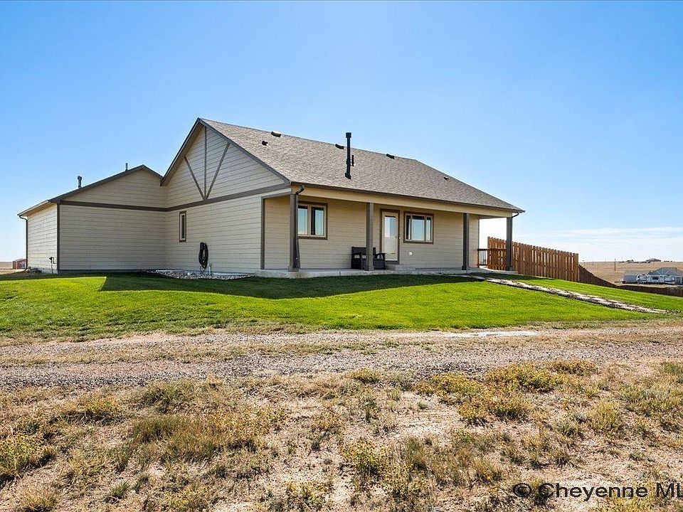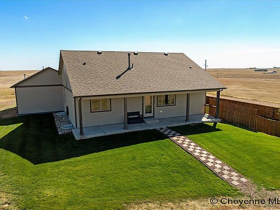 Experience Wyoming living at its finest! This affordable rural property just north of Cheyenne boasts a stunning home with upgraded hardwood floors. The spacious kitchen features a full suite of stainless steel appliances, cityscape cabinetry, and plentiful counter space. The primary suite offers luxury with an en-suite bathroom featuring a large shower, custom tile, and a walk-in closet. There's also a sizable second bedroom and another full bathroom on the main level. The laundry/mud-room connects to the garage and includes extra storage with a pantry. The unfinished walk-out basement, insulated with gap foam, awaits your personal touch. The home is equipped with high-efficiency forced air heating, central A/C, a whole-home humidifier, and an Ecobee smart thermostat, along with upgraded main floor casement windows. The oversized, insulated, and heated 2-car garage is ideal for additional storage or a workshop. Enjoy multiple outdoor spaces like the patio off the basement, a covered patio, and porch, perfect for watching Wyoming's breathtaking sunrises and sunsets. The basement patio is reinforced for a hot tub. The property is beautifully landscaped with expansive lawns, retaining walls, fences, and mature trees, making this one of the best deals in the Cheyenne rural market!