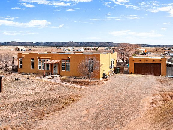 Beautiful Santa Fe Style home on 2 ac. Horse property with spectacular views. 3 bed, 2 bath, LR and family room. Wood burn fireplace., Master has walk-in-closet. Central air. Newer appliances, farm sink, walk-in pantry, Island in kitchen, eat-at kitchen counter. Lots of windows making the home light and bright. Ceiling fans. 2 car garage. Water storage tank, and 1 propane tank. 2x6 walls. Having your water delivered is no different than having your propane delivered. Solar is leased but Seller will pay it off at close of escrow.