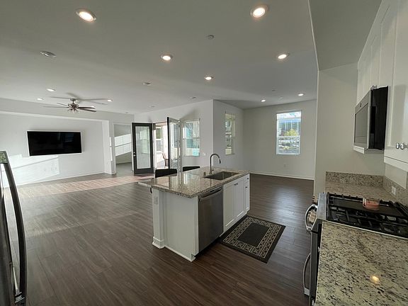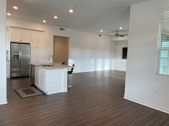 This gorgeous new 2022 build SINGLE STORY condo is ground level, a flat surface from the garage through to the kitchen is perfect for families with small children, people with mobility issues, or anyone who prefers not to climb stairs. This 2 bedroom, 2 bath condo is bright and spacious with lots of windows and recessed lighting throughout. The Valencia FIVE POINTS community has many amenities included in the lease such as 3 pools, cabanas, BBQ grills, community garden, and trails for hiking, biking and walking. Only 4 years old, the condo includes state of the art stainless steel appliances, granite countertops, smart technology, solar, upgraded shutter blinds and easy to clean wood floors. All doorways are ADA compliant and maneuvering a wheel chair is easy. Also included are 3 mounted tv's (as shown) in both bedrooms and living room. The included washer dryer is only a year old. Lessee responsible for gas, electric, trash, cable and internet. Lessor pays for exterminator (ants/spiders), solar and HOA.