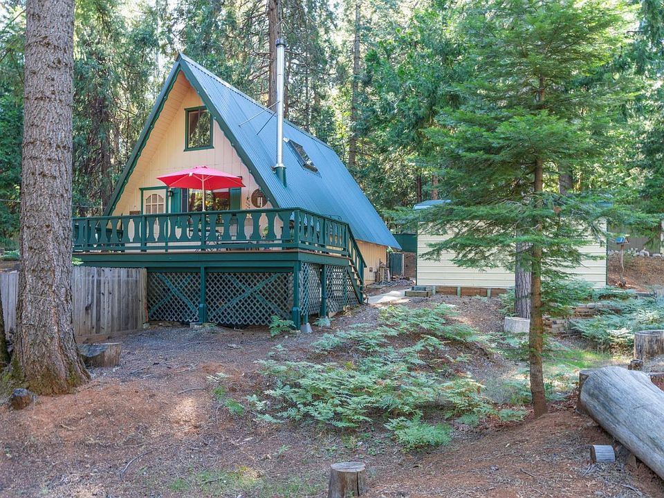 Discover your ideal mountain retreat in this charming two-story A-frame cabin, nestled among the trees and ferns. This move-in-ready gem offers the perfect blend of outdoor adventure and cozy indoor living. Enjoy campfires in the summer and snug winters by the new wood stove from Sierra Hearth and Home. Situated on a nearly 1/3 acre corner lot, this property features a partially fenced yard, ideal for pets to explore safely. Additional perks include a concrete driveway, garage, newer upgraded 200 amp electrical service, fiber optic internet, and a wood deck for grilling and relaxation. Rest easy knowing that pest, roof, and septic inspections have been recently (2020) completed with clearances provided. This cabin boasts unique charm, year-round accessibility, and ample opportunities to explore the stunning Sierras. Convenient storage options include a shed and space under the house. Make this mountain oasis your own and enjoy the serenity of the Sierras at your doorstep.