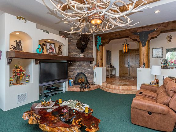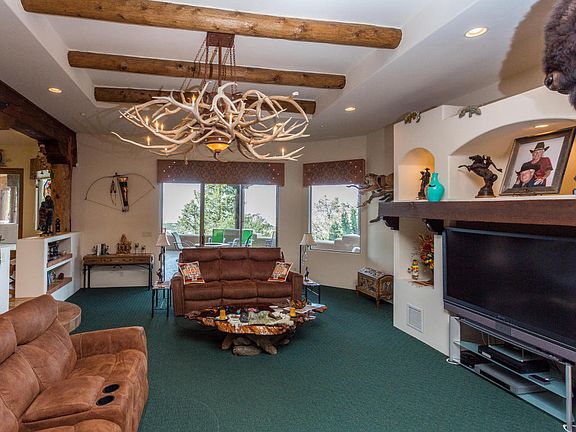This SINGLE LEVEL custom Santa Fe home is situated on 2 parcels (both convey), perfectly positioned on the property to take advantage of the best views that all of Prescott has to offer and has over 2,000 sq. feet of garage/shop space all with a nearly level driveway! Features include a split bedroom and great room design concept with full bar & seating, 4 fireplaces, 4 bedrooms (3 en-suite), gourmet kitchen, massive laundry/utility room and in excess of 1500 sq. foot of covered rear patio complete with gas firepit. Views include Mingus, Flagstaff, Granite Mountain, the Dells & Watson Lake. Gourmet kitchen offers massive island perfect for entertaining, large gourmet kitchen with knotty alder cabinetry with crown moulding, decorative glass front accents, pull out oversized drawers,