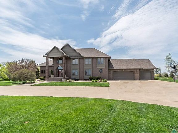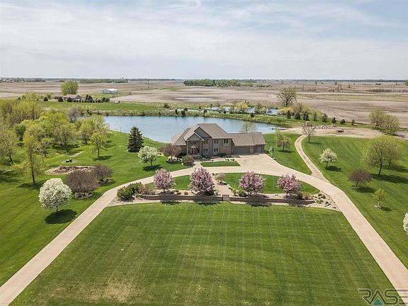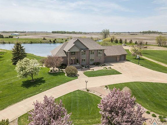 Amazing two story walkout home on 9.29 acres complete with its own lake just 5 minutes from Sioux Falls. Above grade finished sqft is 4137 with a potential 2167 sqft that can be finished in lower level. There are mature trees everywhere. The brick on the front really makes it stand out. Once you enter the home you are greeted by a family room which has 18' ceilings open to the great room. Some other highlights of the main level are the tiled laundry/mudroom and a custom kitchen with plenty of storage. The main floor master suite has a large walk-in closet, dual sinks, and a relaxing Jacuzzi tub. The upper level has a lofted great room, 2 bedrooms, and a large play room above the garage. The lower level walk-out basement is insulated and waiting to be finished. Behind the house comes with your own private lake, big enough to jet ski on. Don't miss out on this amazing home. Must See!