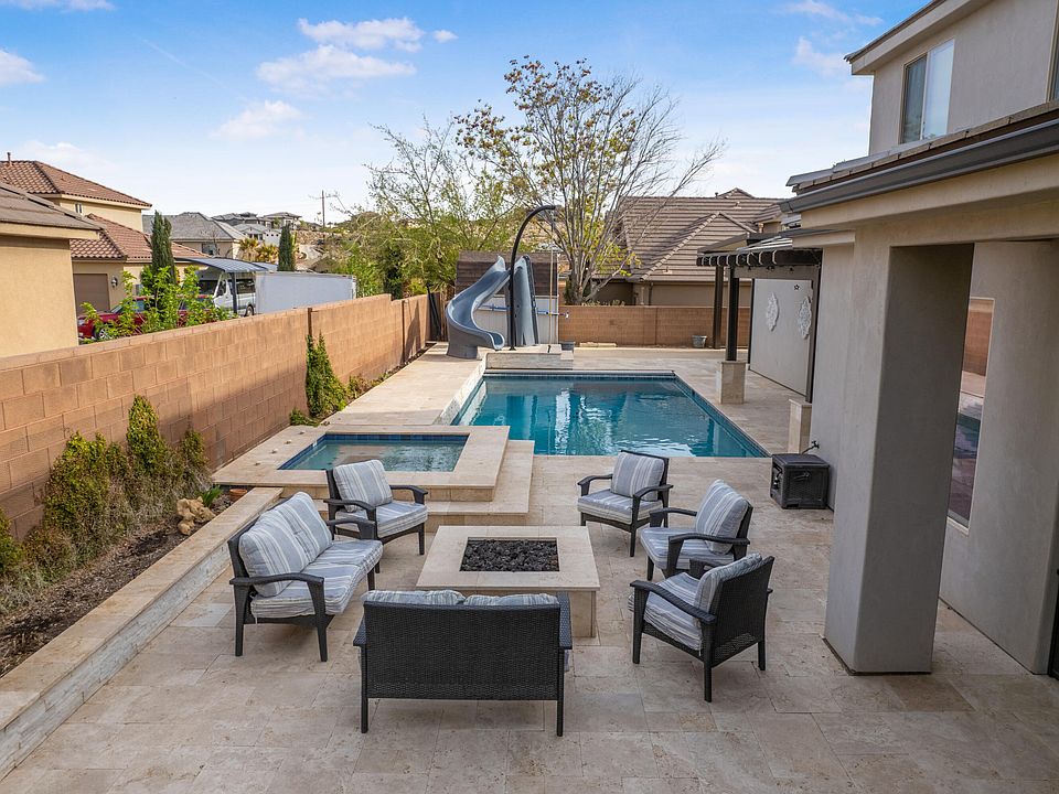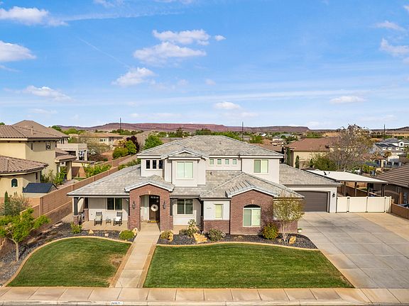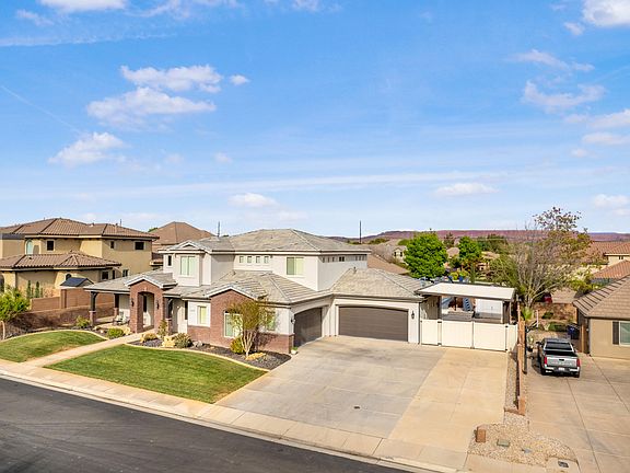 This beautifully crafted custom home is nestled in the sought after Little Valley community, offering exceptional design and attention to detail throughout. The open living room features built in cabinetry and shelving along with a cozy fireplace. The gourmet kitchen is equipped with high end appliances, huge island, spacious pantry and ample cabinetry. A private office is located just off the entry. Upstairs, a second family room offers additional living space for entertaining. The oversized 4 car garage includes an attached carport for RV parking. The backyard is a desert oasis featuring a sparkling pool with slide and automatic cover, relaxing hot tub and built in gas firepit. A specious covered patio provides plenty of room for outdoor dining. Ideal location! Close proximity to schools, parks, shopping, and more! Enjoy lower utility bills with Dixie Power.