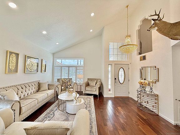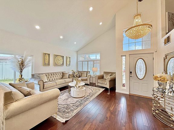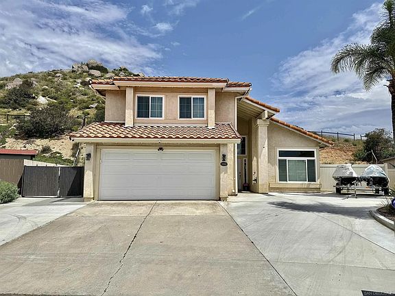 Tucked away at the end of a quiet cul-de-sac in the desirable Corte Madera community, this beautifully updated 2-story home sits on a generous 12,042 sq ft lot with architectural drawings for a potential ADU included, offering an exciting opportunity for future expansion or rental income. Inside, vaulted ceilings and abundant dual-paned vinyl windows fill the home with natural light. Rich engineered Acacia wood floors flow throughout the main level, complementing the stunning kitchen equipped with stainless steel appliances, granite countertops, glass tile backsplash, and a large stainless farmhouse sink. The cozy family room features a charming fireplace, perfect for relaxing evenings. Energy-efficient SOLAR is already installed. The spacious primary suite upstairs showcases vaulted ceilings, ample closet space, and a beautifully updated ensuite bath. Step outside to a private backyard retreat with a raised spa and patio, ideal for entertaining or peaceful lounging. Just 25 minutes from downtown San Diego and minutes to shopping, dining, theaters... This home offers comfort, style, and future potential all in one.