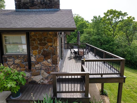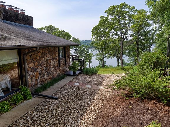 Truly one of a kind Table Rock Lake home. This home exudes character from the stone exterior, interior stone accents and archways, cedar lined vaulted ceiling, one of a kind staircase railing, raw edge stairs, beautiful lighting...it is incredible. The timeless details of this home are impeccable. When you walk in you are in complete awe of the design but also the view! Large open concept living, dining, and kitchen with a fireplace insert. Master bedroom has its own wood burning fireplace, a walk in closet, an incredibly designed bathroom, and the cutest little glass sunroom. Three more bedrooms (all with walk in closets), a full bath and laundry room complete the upstairs. All the bathrooms look like something out of a magazine! Downstairs has a large family room with yet another wood burning fireplace, the 5th bedroom, and a full bath. Oversized 3 car garage with a heated and cooled workshop room. Very nice large shop building with an adorable porch that runs the length of the building complete with lake views! To say this house is tidy is an understatement and that goes for garage and shop too!! All this and a park like setting with simply beautiful landscaping. Boat slip available for an additional $55K is just a buggy ride away.