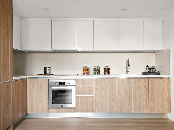 The Porcelanosa custom kitchens feature Glem White Nature porcelain slab countertops, a full-height backsplash clad in Capri Bone tile, and perfectly designed chrome fixtures. Custom smooth white and textured cabinets along with underlighting complete these innovative and functional kitchens. Select one-bedroom homes feature full-height pantries and peninsulas with porcelain waterfall countertops. The integrated kitchens are equipped with the best appliances from Bertazzoni including panelized refrigerators and dishwashers.
