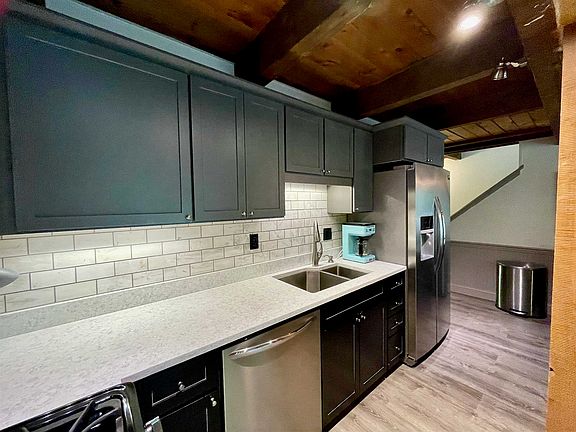 Impeccably updated townhouse adjacent to the White Mountains National Forest just off of West Side Road. Completely renovated from top to bottom. Open concept living, dining and kitchen with exposed wood beam ceiling creates a rustic and warm vacation feel. The spacious galley style kitchen makes entertaining a breeze with custom soft-close two tone cabinets, stainless steel appliances, beautiful white quartz countertops and a timeless subway tile backsplash. First floor bedroom and bathroom for those needing one floor living. Two additional bedrooms, bathroom and a loft make up the second floor. The finished basement makes a perfect recreation/family room. Both bathrooms have been updated with new vanities, granite countertops, tiled showers, plus a bench in the second floor shower. Additional upgrades within the last 2 years include new flooring throughout, new Rinnai heater, new windows, sliding glass door, new deck, fresh paint and spray foam insulation added to the roof and eves. Roof is 5 years old. Nothing to do but move in and enjoy! Easy access to all valley amenities, yet quietly tucked away off of West Side Road. Home is being sold mostly furnished with some exclusions.