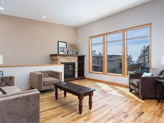 New finished construction contemporary home in beachfront Koho Oregon Development. soaring vaulted ceilings and floor to ceiling windows to let in the natural light and beautiful ocean and bay views. Fantastic open concept layout, 2 bedroom 2 and a half bath with attached two car garage with electric vehicle plug in. Luxury finish details, solid oak hardwood flooring throughout main level, Custom fireplace with natural stone and wood.