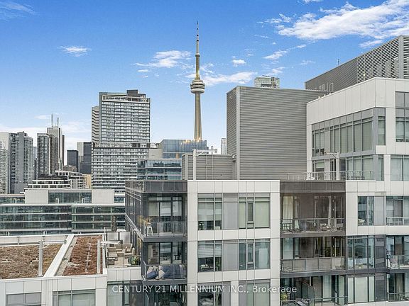 Welcome to upscale living in this stunning 2-bedroom, 2-bathroom condo, offering 721 sq. ft. of thoughtfully designed space in the highly desirable King West neighbourhood. This bright and well-maintained unit features east-facing exposure with unobstructed views of the CN Tower. The condo boasts a spacious open-concept living area with floor-to-ceiling windows and a walk-out balcony. The modern kitchen is equipped with built-in appliances, a custom oversized island with a bar fridge, and upgraded lighting fixtures throughout. The primary bedroom offers a side-by-side walkthrough closet space, a 4-piece ensuite bathroom, and high-quality automated blinds. Enjoy the convenience of an oversized underground-owned parking space, an oversized private locker, and in-suite laundry. The building offers unparalleled amenities, including: 24-hour security, an outdoor pool with a lounge area, an outdoor BBQ and dining space, an indoor lounge and dining space, guest suites, and a fitness centre. This condo is located in an incredible area with a Farm Boy grocery store and Dollarama on the ground floor. It is within walking distance of the highly anticipated 'The Well, and STACKT market. It's also close to Billy Bishop Airport, the CNE grounds, excellent restaurants, and historic Fort York. Easy access to the Gardiner Expressway, DVP, and streetcars at King and Bathurst are just steps away. A perfect blend of luxury and convenience awaits you! Maintenance fees include heat, water, building insurance, and building maintenance. The property will be vacant upon closing.