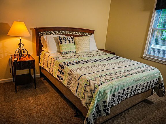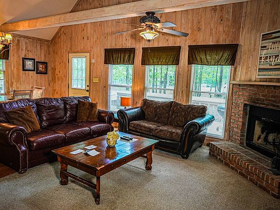 Chalet 27 is a generously-sized chalet with three bedrooms, situated in a serene wooded environment It offers an open floor plan, a fully equipped kitchen, and a comfortable living room complete with a charming fireplace, creating a welcoming atmosphere. The dining area is perfect for enjoying meals together, and the deck includes a charcoal grill for outdoor cooking. Additionally, there is a washer/dryer available for your convenience. Upstairs in the loft area, you will find one twin bed and one queen bed, while each of the bedrooms downstairs features one queen bed. Renter is responsible for electric Water, trash pick up, cable, internet, maintenance and 24 hour security included. small dogs allowed with additional fee