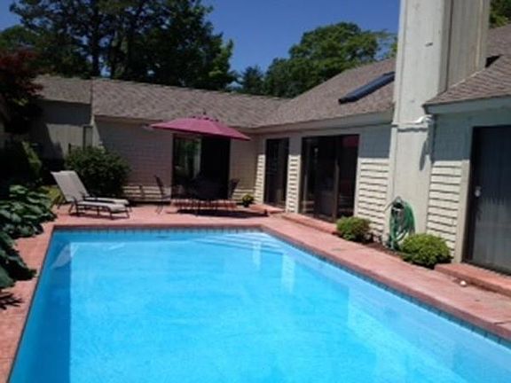 Located on the golf course at New Seabury, this home is the perfect investment or summer getaway for the family. Extremely strong rental history ($3,200 per week) and rents every week of the summer. Open layout with 3 bedrooms, 2 bathrooms, huge living dining area and separate den/tv room. All rooms face your own private in-ground pool with new heater! vaulted ceilings, hardwood floors, central air and open kitchen ideal for entertaining.