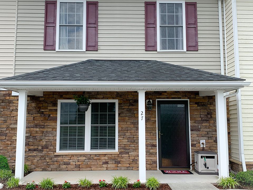 This pristine town home is the full package! 1st floor contains 9' ceilings, freshly painted neutrals, and crown molding. Dream kitchen/dining room with lots of cabinets and counter work space, recessed lighting, black appliances (brand new LG dishwasher) and hardwood floors. Living room is perfect size for entertaining with 1/2 bath, coat closet, and under-the-stairs storage! 2nd floor, spacious master bedroom with cathedral ceiling and ceiling fan, walk-in closet, and private bath. 2nd floor also features 2 additional bedrooms equipped with large closets, a 2nd full bath, and laundry closet with full size washer and dryer combo. Outdoor highlights include: lovely front porch, stamped concrete patio for relaxing, stone veneer and vinyl siding exterior. A must see!