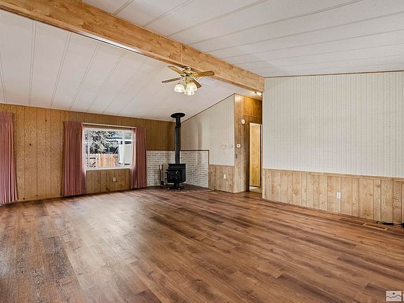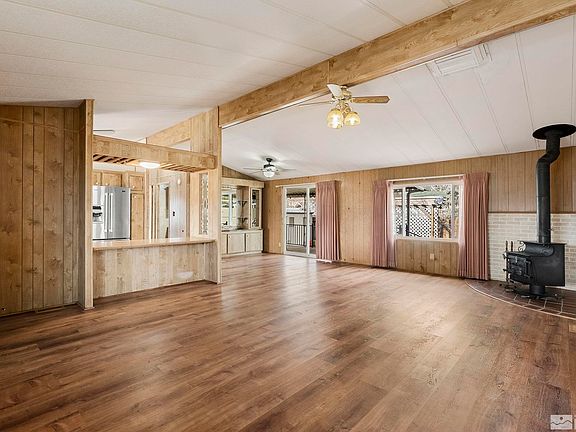 Lovely, well cared for home on a large corner lot. The spacious great room boasts a wood-burning stove, newer vinyl tile flooring and a built-in hutch. You'll love the split floor plan, the new carpet in the primary bedroom and newer vinyl windows throughout. The backyard is a wonderland of delight including a fountain, a gazebo and a large covered deck. The front yard features three fruit trees and a roomy deck with newly installed Trex decking. You'll also find RV parking and three storage sheds., Home is to be sold AS-IS.