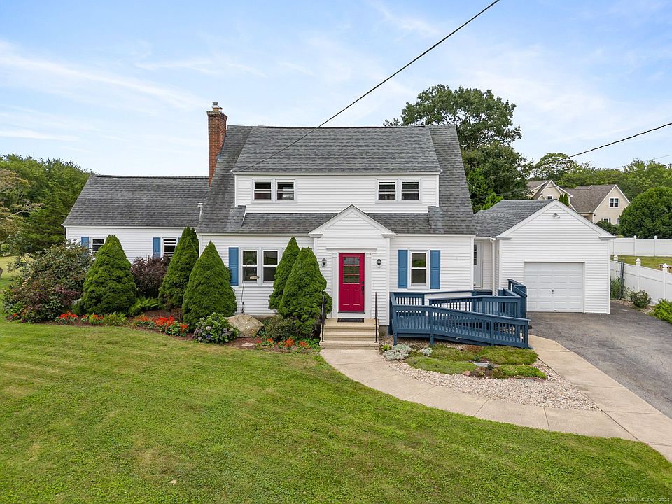 Nestled in the tranquil Quaker Hill community, this charming lakefront Cape offers 1,944 square feet of comfortable living space. With 3 bedrooms and 2.5 baths, this home perfectly balances classic charm and modern convenience. The main floor features a spacious kitchen ideal for all your culinary creations. The living room/dining room combo offers an inviting space for gatherings, while the Primary Bedroom Suite provides a private retreat with a full bath. The convenience of a main-floor laundry room and a half bath adds to its functionality. A breezeway connects the home to a 2-car tandem garage, offering additional storage or workspace. Upstairs, you'll find two generously sized bedrooms and another full bath, making it perfect for family or guests. The expansive backyard is a true oasis, featuring a covered patio for entertaining, an in-ground pool for summer relaxation and plenty of space to enjoy lakefront living! This home is not only beautiful but also exceptionally economical, thanks to its solar panels and pellet stove that help reduce energy costs. Newer windows and roof with transferable warranties add to the home's energy efficiency. Ideally located, this property is close to Electric Boat, Connecticut College and the US Coast Guard Academy, making it a convenient choice for those working in or around these institutions. Don't miss the opportunity to own this beautiful lakefront Cape and enjoy a blend of serene living and modern amenities.