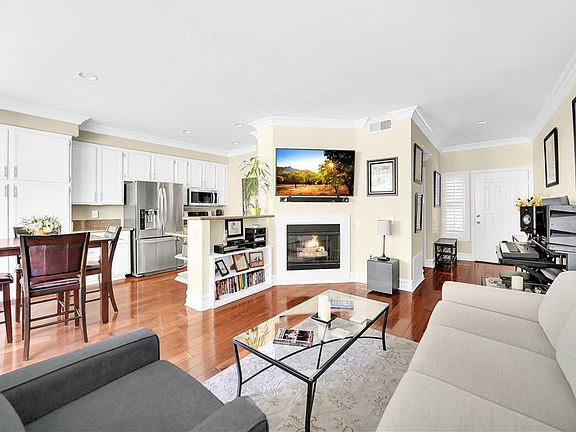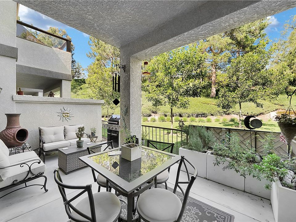 Are you looking for a lower level turn key condo in a private location with an extended patio overlooking a lush greenbelt and hillside? Well you just found it! Open floorplan great for entertaining. Rich looking flooring, detailed baseboards, crown molding, recessed lighting, plantation shutters, high ceilings and soft two-tone paint. Eat-in kitchen has granite counters, large single basin sink with updated faucet, stainless appliances and plenty of cabinet space. Kitchen and living room wall has been lowered to give a more open concept. Living area has a built-in media center and gas fireplace. Spacious primary bedroom, large closet with mirrored wardrobe doors. For your outdoor pleasure, the extended patio allows for a welcoming sitting area that overlooks the lush greenbelt and landscaped hillside. 1 car garage with storage cabinets. Salerno community offers a pool, spa & bbq's. Foothill Ranch association gives you access to a renovated clubhouse, pool/spa, and kids pool at 27021 Burbank, Foothill Ranch. Nearby is a large city park and the 2500 acres of Whiting Ranch for hiking and biking. Just down the hill, is shopping, dining and entertainment. Close to the 241 toll road. A MUST SEE for your fussiest of buyers.