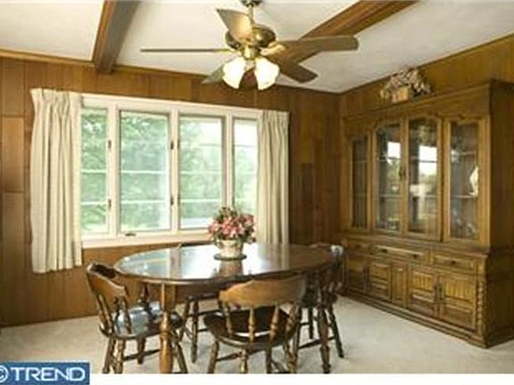 Ewing's Hillwood Manor presents this hillside ranch on three quarters of an acre of land, backing to a winding creek. Wood floors are preserved under carpet and are found throughout except the kitchen, sunroom and bathrooms. A large picture window envelops the living room in sunlight as the fireplace offers ambiance. A charming built-in corner cabinet is a perfect China display in the dining room with decorative beamed ceiling. The eat-in kitchen has a wall oven and broiler and a stovetop with griddle. Corner windows enhance the breakfast nook. Nearby is a sun washed sunroom. Close by is a bedroom with a private half bath while opposite, the bedroom wing includes two additional bedrooms, each with their own full bath. One bedroom offers a private entrance to the front yard. The lower level houses the utility room, laundry room, and access to the two-car garage. This versatile level offers an abundance of potential for future space. The deep backyard features a fenced-in area, shed, and borders park land.
