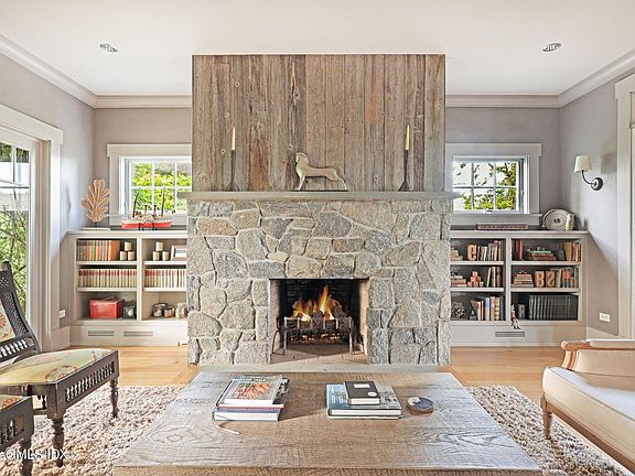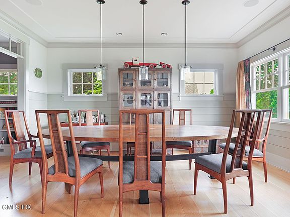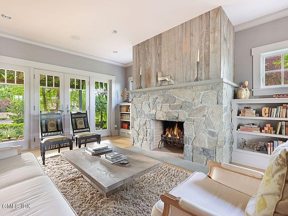 Beautiful light filled shingle style home set high above the Mianus River Valley in Greenwich; views of open sky, treetops + the river. Five bedrooms; Primary suite with sitting room, luxury bath and screened in porch with hanging bed, 3 double bedrooms and 1 single with Jack + Jill baths. Open floor plan with eat-in gourmet kitchen open to dining room, family room with french doors to deck and covered outdoor room, den and living room that opens to seating area under pergola. Large deck with covered room, putting green/turf backyard, fire pit + bball hoop. Playroom on 2nd flr. LL has a kids play space (climbing wall, zip line, turfed and padded), + add'l entertaining room with gas fireplace + bar and home office. Game rm/studio on the 3rd flr. Available partially furnished or unfurnished 2025-07-14