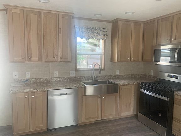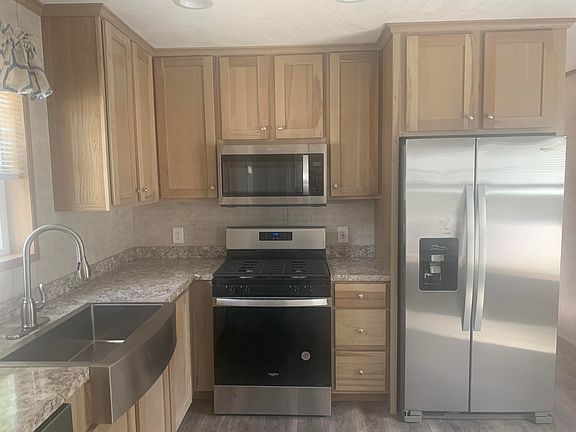 BRAND NEW HOME.....and it is a Beauty!! This home has the nicest feel to it and very welcoming kitchen with stainless appliances, and nice looking floors that run through the interior. This home has a master bedroom with private bathroom that features a walk in shower! There is another bedroom and bath at the other end of the home. The home is on a nice looking lot and has private parking spaces and a large shed!! 2x6 construction and the home is heated with gas and also has a gas range as well. This is a really sharp looking home for a great price!! Come take a look.