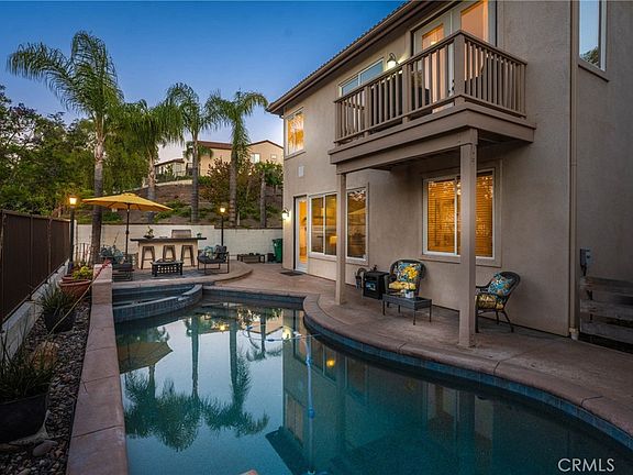 Looking for a 5 bed, 3 bath, with a POOL under 1.5M in RSM? Welcome to 27 Crystalaire. Located in the beautiful community of Las Flores & Bel Flora, this home situated on a quiet cul-de-sac zoned to the Blue Ribbon Las Flores Elementary, Middle School, and Tesoro High. As you enter, you are greeted with a grand entrance with dramatic vaulted ceilings, formal living room with large windows, and a beautiful curved staircase. This property has a total of 5 bedrooms with 3 bedrooms upstairs, and 2 beds downstairs; PERFECT for the buyer that wants a guest room + full bathroom + an office downstairs. The layout of the kitchen is perfect for your chef that loves to entertain with a center island, second dining area, and a generous amount of granite counter space that flows into the family room and backyard.. As you walk up the curved stairway, you are truly blown away with the 20-foot ceilings, ample natural light, and beautiful plantation shutters. The master bedroom is spacious with a balcony to enjoy the view of your amazing backyard. The master bath has a walk-in shower, soaking tub, + a huge walk-in closet. 2 additional bedrooms up + full bath and laundry room upstairs. Let's not forget about the backyard! With a pool, BBQ Island + bar seating, and lounge area. It doesn't get any easier to entertain your guests! Worried about the pup? Keep him entertained in the the small dog run with decomposed granite in the side-yard! Did I forget to mention fully paid off solar? With a huge pool home like this, it's almost a necessity. You can thank the seller for your low electric bill! The community of Las Flores is a sought out community with great schools, parks, walking trails, tennis courts, basketball court, pools + spa. Don't miss out on your opportunity to own a beautiful home in RSM!