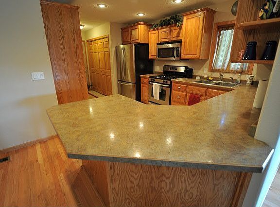 Upscale, quality home with lots of light! Beautiful 3 bedroom, 2 bath twin home in Golf Course Addition with oak hardwood floors, main floor laundry, large master bedroom with walk-in closet, open floor plan for kitchen, dining, and living room, and partially covered patio deck.