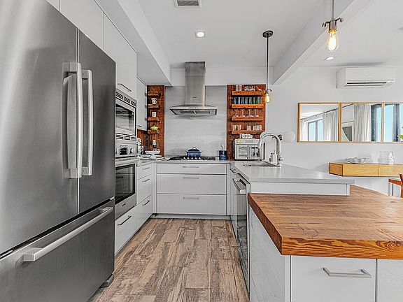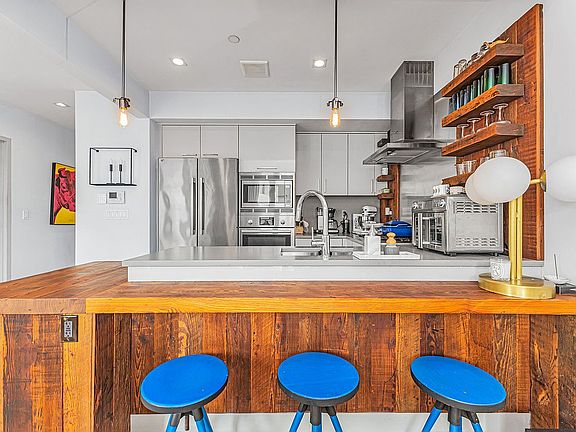 The open living and dining area features floor-to-ceiling windows and hardwood floors throughout. The chef’s kitchen is equipped with Bosch appliances, Caesarstone countertops, reclaimed wood accents, and a breakfast bar—perfect for everyday cooking or entertaining. The two oversized bathrooms include deep soaking tubs, heated floors, and custom vanities. Additional highlights include a walk-in closet, in-unit washer/dryer, Mitsubishi split heating and cooling, and access to a common roof terrace with sweeping skyline views.