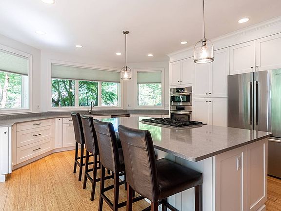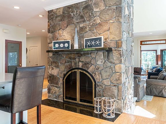 A stunning home on a spectacular acre plus lot with the association dock right next door, so it's almost like a private dock. There's also a private island that comes with this property. The first level has a brand new chef's kitchen with Bosch and Thermador appliances, floor to ceiling field stone fireplace which open to the kitchen and the living room, gorgeous bamboo floors throughout, lots of sliders let in beautiful light. The den has rich mahogany built-ins and wood stove. Spacious dining room and half bath. A 2 car heated garage is attached. The second level features a master bedroom with balcony, huge walk-in closet, huge master bath with Brazilian cherry floors, Jacuzzi and steam shower. 2 more bedrooms, a full bath, and laundry. There is also a new home office. The third level features a bonus room with wet bar, refrigerator, fireplace, full bath, and a balcony. There are gorgeous waterviews from nearly every room. The dock has water, electricity, and direct ocean access.