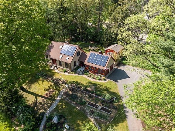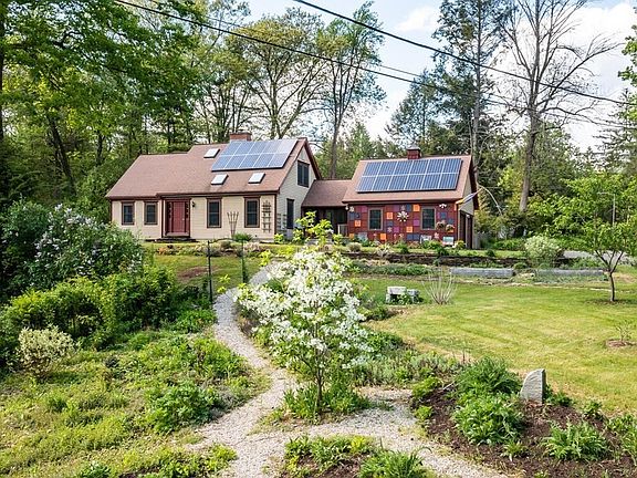 Sunny, welcoming 4bed/2 bath/2-car Cape + detached backyard studio...all on a quiet Florence side street! The main house is flooded with natural light from skylights and oversized windows. The first floor features a spacious living room with dining area, cozy den with fireplace, granite counter kitchen with stainless appliances and enclosed mudroom/breezeway leading to deck with hot tub overlooking spacious, fenced rear yard. Two bedrooms and a full bath complete the 1st floor. The 2nd floor offers two additional generously sized bedrooms and a renovated bath with glass-enclosed walk-in shower. Finished room in lower level too. 320 sq ft studio only 3 yrs old, fully insulated, with mini-split for heat+A/C, and full electrical. Beautiful front yard garden with fruit trees and a wonderfully curated plant and flower garden with wandering pathway. Owned solar panels! Central heat and A/C w/ UV sanitizing air filtration system.