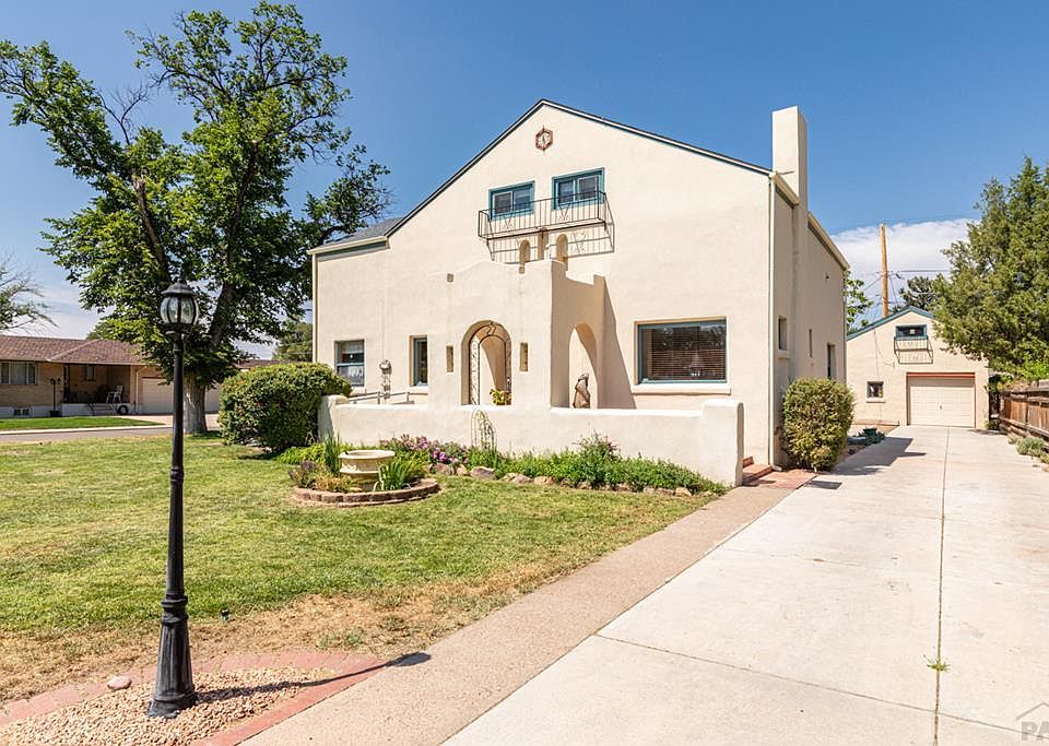Historic, custom, well-maintained, Mediterranean-style charmer on corner lot in Pueblo's coveted Aberdeen neighborhood. As you walk up, notice the arcaded porch, arched doorways & thick 15â walls of block &stucco which keep the interior pleasant, private, quiet, & energy efficient. Inside, notice the large rooms, 9' ceilings, oak floors & wood-burning fireplace w/insert. The South facing placement ensures year-round natural lighting, healthy plant growth & rapid recovery from winter weather. Notice the artistic touches in the arched and glass block doorways. Modern kitchen features maple cabinets w/crown molding, granite countertops, & stainless appliances. Well planned layout is efficient & functional for cooking & baking. The guest suite w/updated bath on 1st floor could be used as a main level master. Notice the hand-painted stencil work on this bedroom ceiling giving it a luxurious coffered feel. Sitting area at the base of stairway could be used as an office with custom-built shelving & storage. Don't miss the detail of the ceiling in this room! Dramatic banister & stairway lead up to 2nd floor which contains a cozy family room, three more bedrooms & full bath. The separateness of the upstairs rooms lend themselves to telecommuting without disruption. Master bedroom has two full closets for ample storage. Laundry is conveniently located next to the master. Front yard is beautifully manicured with lawn, perennials & trees. Fully fenced backyard has deck & patio areas.
