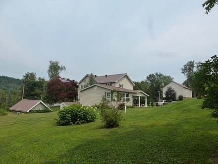 Complete info: http://5acresfarmhouse.CheckOutMore.com - UNDER Contract. Overlook views from back field. Lovely 2 story well maintained with 2006 1st floor quality addition of family room/bedroom suite choice; full handicap bath & foyer hiding laundry. Access private covered patio thru patio doors. Tile backsplash highlighted by new custom Hickory cabinets with meganite counter, tile floor and newer appliances. New trusses and roof in 2012. Central Vac. 28' X 40' Bank barn with 2003 metal siding upgrade. Great for garage and storage or business opportunity. Spring fed pond with fish... Crappies, Bass and Bluegills. All on 5.3 acres. Dream of a huge garden/ vegetable farmette?? ... plenty of open terrain. Potential for entrepreneur of choice. Visible High Street road frontage. Call today.