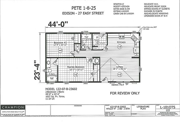 Location: 27 Easy St in Egg Harbor Twp Community Address: 27 Easy St, Egg Harbor Twp., NJ 08234 Manufacturer: Redman Homes Champion Homes Type: New Construction Manufactured (HUD) Bedrooms: 2 Baths: 2 Price: $168,000 Size: 24 x 44 Nominal Square Footage: 1056 Nominal Year: 2025 Availability: Immediate Parking: We have a one person - one vehicle restriction in the Lease, with a maximum of two vehicles, only if there are two drivers. The Lease sets a maximum of two vehicles for any one home. More than two vehicles are restricted by the Lease. HOME FEATURES: Siding: Vinyl (Bayou Blue) Shutters: Vinyl (White) Walls: Vinyl over gypsum board (Weathered Reef) Cabinets: White Countertop: Laminate (Drama Marble) Appliances: 4 Stainless Steel Whirlpool Flooring: Laminate (Brianka) and Vinyl (DF9570- White Cashmere) Roof: Shingles Additional Features: Backsplash: Pearl Glass tile Insulation in walls, floor & ceiling Central Heating & Cooling System High Efficiency Gas Furnace: 60 BTU Perimeter located floor vents Whirlpool Stainless Steel Appliances: Gas Range, Dishwasher, 22' cu ft Refrigerator & Microwave over Range, Stained Gray Wood Kitchen & Bathroom Cabinets with adjustable shelves Laminate Countertop 40 gal Gas Water Heater Low E Thermal Pane Windows 100 AMP Electric Panel LED Recessed Lighting throughout house Cable TV Jacks: Bedrooms & Living Room One Piece Fiberglass Shower Stall with Glass Sliding Door One Piece Fiberglass Tub in Hall Bath Plumbed for your Washer and Gas Dryer Custom Steps Concrete Foundation System Heat Tape & Insulation on water line Seamless Gutters & Downspouts Andersen Glass Storm Doors at Front & Rear Doors Full Vinyl Skirting with top & bottom trim Manufacturer's Limited Warranty Energy Star Certified