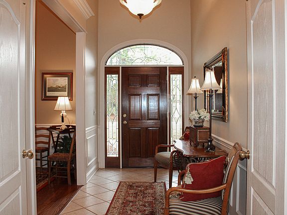Beautiful white columned brick 4bd/2.5ba, one story with upscale architectural details including 12' ceilings in the inviting foyer, onto the gracious formal dining with perfected wainscoting, 12'' moldings, and ''real'' hardwood flooring. The sliding French door opens to the cook's dream kitchen with all high-quality appliances including a second oven, all pull-out drawers below the counters plus a serving bar open to the casual dining with a large 4 window bay area. The open great room flows from the foyer and kitchen areas also with 12' ceilings, triple tall windows, and a gas log fireplace. The private master retreat features tray ceilings, special reading lights, dual walk-in closets, plus a well-appointed master bath. The quiet sleeping zone is located on the south wing with bedrooms #2 and #3 offering a tall front window, and a 2-door wardrobe closet. Bedroom #4 is a backyard view haven with windows across the rear. Both front and back porches are high quality aggregate, and a rear deck extends from the screened back porch. The two car 22'x23' garage opens onto an extra wide concrete drive and features a (8'x16') storage space. A complete NEW ROOF was installed in August of 2022!! Located in the coveted Long Leaf Elementary School district in Oak Grove with access to Hwy 98 West, Hwy 589, and W 4th Street is convenient to Hwy 49. This carefully maintained one-owner home is ideal for both a young growing family and a mature family. Welcome Home!
