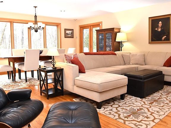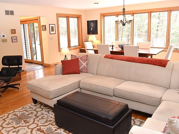 Come see this custom contemporary on a quiet cul-de-sac in desirable Amherst Woods. With one of the largest lots in the development, you'll find privacy, and quiet. The large south facing windows in the living/dining room offer not only light, but warmth and views of nature. The eat-in kitchen with custom natural red birch cabinets, up scale appliances, and lots of work space is the quintessential heart of the home. With 3 bedrooms and 2.5 baths, there is plenty of room to spread out, a TV room or home office on the lower completes the space. First floor laundry off the mudroom adds convenience for the busy homeowner. Outside, the large composite deck with hot tub steps down to a big yard for gardens, play or just enjoying the open space to relax. There is extra storage in the eaves, downstairs and above the large 2 car garage. The new Amherst dog park is a short walk away and the Station Road access to the bike path is down the street. Access the Robert Frost trail from your yard.