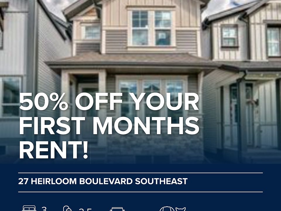 Modern 3 Beds, 2.5 Baths Main Floor/ Upper | No Pets Allowed | 50% Off First Month if move-in on Dec 1/25 Welcome to your new home at 27 Heirloom Boulevard Southeast - Upper a modern and well-maintained 3 beds / 2.5 baths / Main Floor/ Upper offering comfort, space, and convenience. Ideally located close to shopping, schools, parks, and transit. SHOWINGS: Conducted in an open-house format book your appointment today! Prices, availability, and promotions are subject to change without notice. PROPERTY DETAILS: - Furnished or Unfurnished: Unfurnished - Pets: No Pets Allowed - Smoking: Non- Smoking - Parking: Street - Storage Included: No - Laundry: In- Suite Laundry - Management Type: Full Management - Lease Term: Long Term UNIT FEATURES: - Living Space:Open-concept living room layout, perfect for relaxing or entertaining - Kitchen: Sleek and modern kitchen with all appliances for a contemporary look with plenty cabinet storage to keep everything organized - Dining Space: Open-concept design flowing into the living space, perfect for entertaining - Bedrooms: 3 Bedrooms featuring ample storage for clothing and accessories - Window Coverings: Includes window coverings for privacy and light control UTILITIES: - Utilities Included: No Utilities Included Shared Utility Unit: Utilities split between 2 units: 60% Main (Upper), 40% Secondary (Lower). Deposit: $350 for Main, $225 for Secondary (first 3 months of tenancy). Here's a helpful tool you can use to get a rough estimate of utility costs. LOCATION HIGHLIGHTS: - Outdoor Living: Nearby Parks, Pathways, Greenspaces - Transit & Access: Transit Lines / Major Roads Nearby - Family Friendly: Close to Schools, Childcare, Rec Centres - Local Conveniences: Groceries, Shops, Restaurants, Services Nearby Don't wait properties like this don't last long.