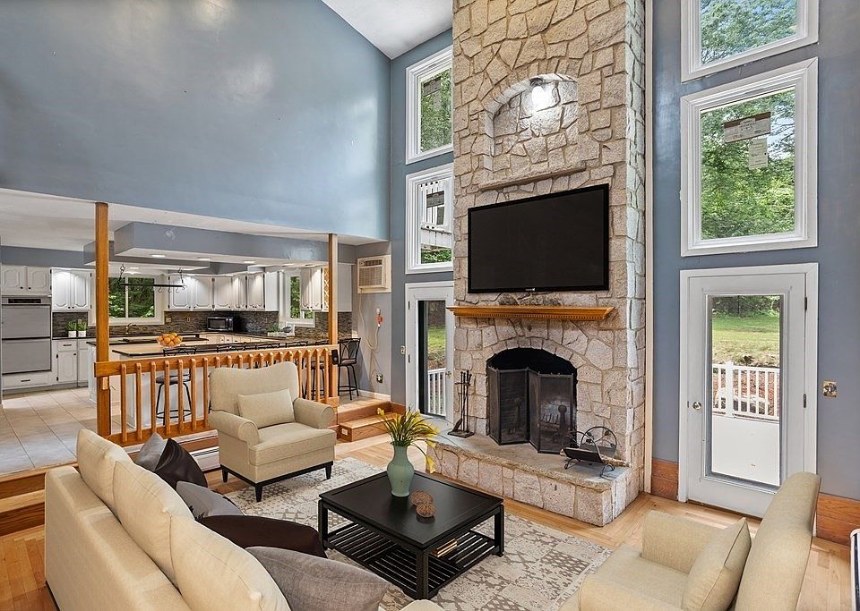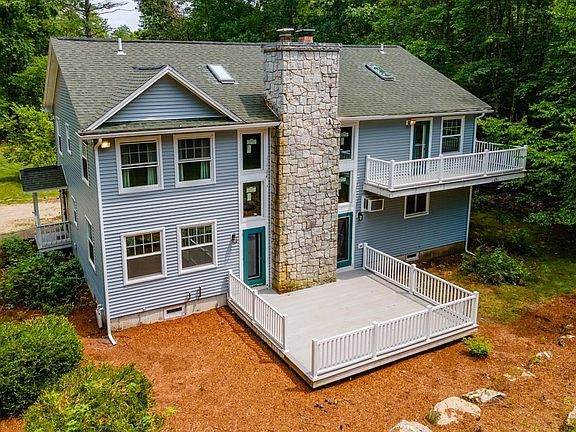 Unique custom-built home, nestled in woodlands offers privacy & picturesque nature views. Welcomed by open flr plan, beginning w/2-story foyer open to expansive FR w/exquisite 2-story stone FP, lg windows, skylights, HW flrs, & access to newly built trex deck. Spacious kitchen provides many desirable features including an abundance of cabinetry, granite counters, island w/cooktop, double ovens, breakfast bar w/seating for 6, & walk-in pantry; a chef’s dream! DR, Den (or office) w/exterior access, & a BR all have HW floors. 1st floor is finished w/full bath. 2nd flr catwalk overlooks FR. Massive primary suite offers skylights, HW floors, double-walk-in closets & security room. Primary bath has shower, sauna, & is ready for jacuzzi tub & double sinks to be installed (provided). Both Primary bed & bath offer ext access to wrap-around trex deck. 2 add’l generously sized beds & full bath complete this flr. 3yr heating system, 1-yr windows & siding. This will go fast, so don’t miss out!