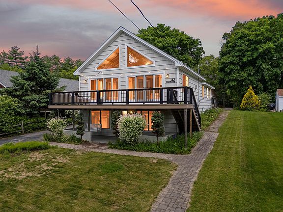 Welcome to 27 Lake Avenue, a stunning 3-bedroom, 2.5-bath chalet-style home with 2,580 square feet of beautifully finished living space and deeded right of way to Sebago Lake—complete with shared dock and private boat morring access just across the street. Designed for comfort and lake life, this home features an open-concept kitchen, dining, and living area with cathedral ceilings, a cozy gas fireplace, and a double set of sliders leading to an expansive deck with breathtaking sunset views. The kitchen is a dream for entertaining, featuring granite countertops, stainless steel appliances, and a large center island. The first-floor primary suite offers ease and privacy, while the finished daylight basement adds flexibility with a spacious family/media room, two sizeable bedrooms, and walk-out access to a private patio area. Enjoy seasonal water views, mature landscaping, and outdoor living at its best. Additional highlights include a large two-car garage with storage above, hardwood and tile flooring throughout, and beautifully maintained grounds. Located just 40 minutes from Portland and the Jetport, and close to Seacoast Adventure, shopping, dining, and I-95, this property offers the perfect balance of relaxation and convenience. Whether you're looking for a year-round home or a lakeside getaway, this is your opportunity to own a piece of Maine's most iconic lakefront living.