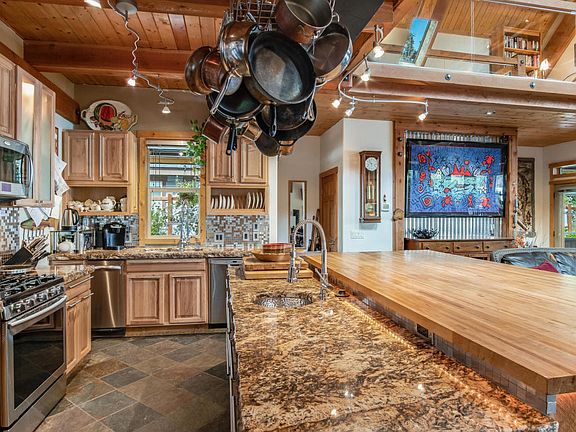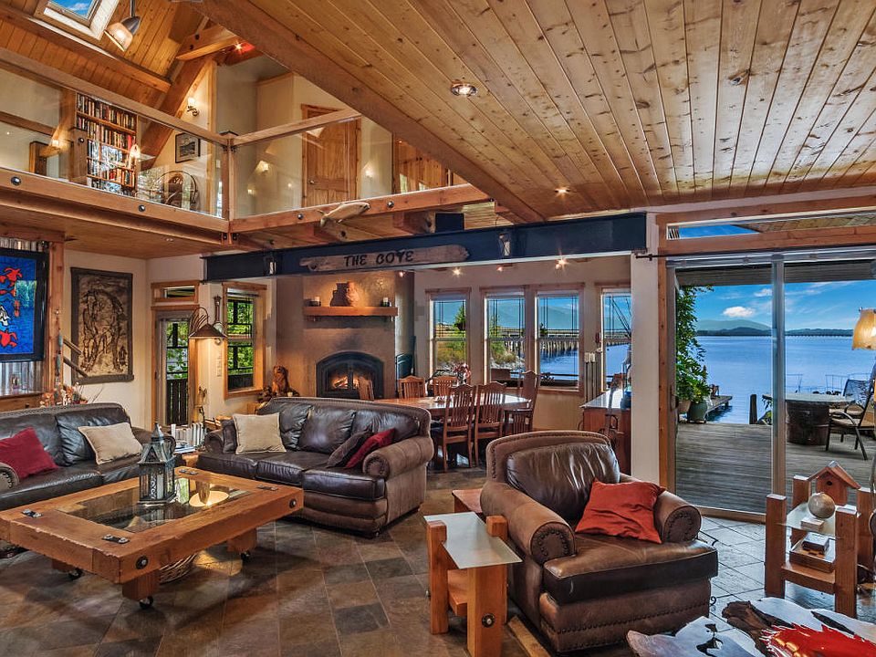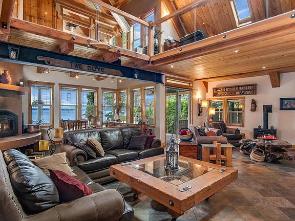 Stunning Timber frame Waterfront home with guest apartment, RV parking and shop (28 x 30 w/ 2nd level)! Incredibly designed with beams that span over 3,900sf, 4 bedrooms (2 masters), office, 4 baths & expansive windows for natural light that flows throughout the home's open layout. Dramatic living room that offers showcasing lake views, a fireplace (wood burning) and inviting spaces. The Gourmet kitchen is stunning with Granite counters, SS high end appliances & custom cabinets. Apartment w/kitchen, living room, 2 bedrooms & office loft. Outdoor living areas include a covered deck, stone patio, rock fountain features mature landscaping, lawn to the water's edge w/sandy beach & private dock. Finished 3-car heated garage w/work shop. Extensive wood, teak floors & tile accents. Forced air