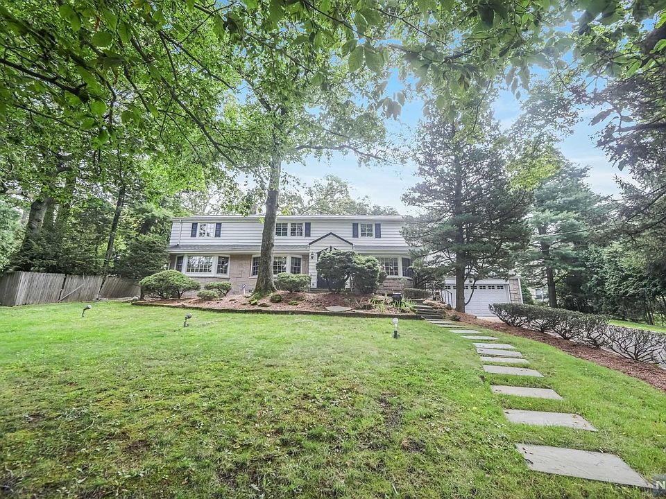 This spacious 4 bed, 4 bath Colonial home sits on a serene cul de sac with Western views. Set on .44 acre lushly landscaped private property with stone patio and terraced yard.Inside, the open layout easily flows between the living and family rooms with a shared fireplace. The chef's kitchen, with granite counters, opens to a sun filled breakfast nook and backyard via sliding doors. A large dining room offers scenic views beneath the tree canopy. A private office with its own fireplace overlooks the backyard. The first floor includes a bedroom and full bath. Upstairs, the Primary Suite features a roomy dressing/office space and attached Primary Bathroom. There are two more bedrooms and a full bath. A spa with sauna and balcony access is an added luxury. The finished basement provides more living space, including an office and full bath. Conveniently located near houses of worship, shops, restaurants, and just 6 miles from NYC, this stunning home presents a remarkable opportuni