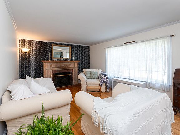 Classic wood-burning fireplaceBar and stageSpacious deckSun-filled primary bedroomShady backyardComfortable family roomDelightful three-season porch