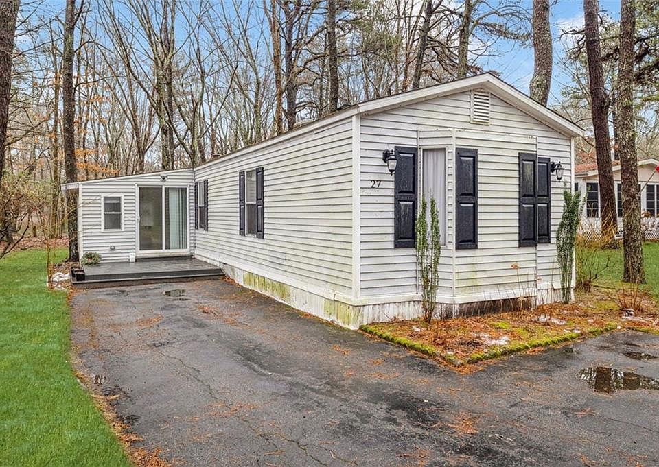Welcome to 27 Leisure Way, a spacious and charming 2-bed, 2-bath mobile home with 1,068 sq ft of living space. The interior features newer engineered hardwoods throughout, creating a cozy and low-maintenance environment. The large kitchen has a great countertop for hosting and ample cabinet space, while flowing seamlessly into the dining area and living room. The master bedroom boasts a large en-suite bathroom with dual vanities. The second bedroom has large closets and tranquil views of the surrounding woods. Both bathrooms are tastefully designed with plenty of space and storage. A standout feature of this home is the fully finished 160 sq ft heated porch, expanding your living space for year-round enjoyment. Conveniently located in a well-maintained 55+ community, this mobile home provides the flexibility of affordable living without compromising on quality or proximity to local services. Embrace a simpler lifestyle without sacrificing comfort! Schedule a viewing to experience this well cared-for home that blends comfort, style, and convenience all in just over 1200 sq ft. If you are thinking about downsizing, this is a perfect place for you! Welcome home!