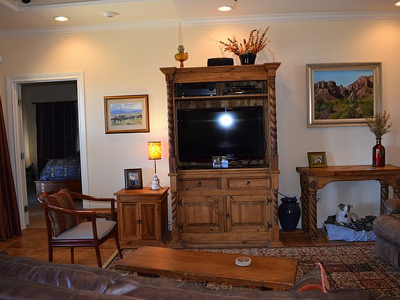 Unique, high ceilings and open floor plan, wide halls and doors, built to be energy efficient. Great back porch with outdoor fireplace and views-our favorite room! Two walk-in showers, colorful native Texas landscape. Quiet neighborhood, community pool as an option.