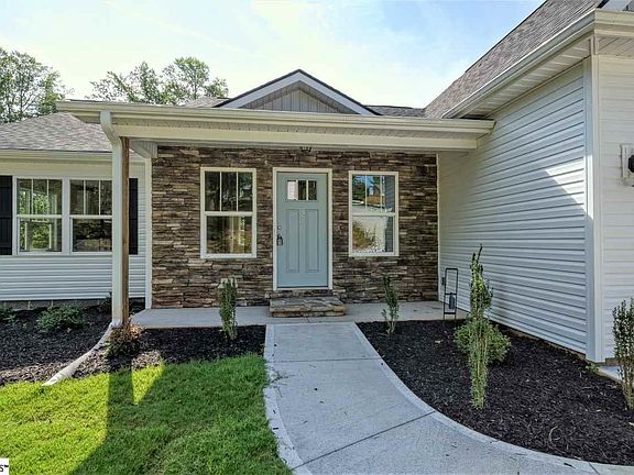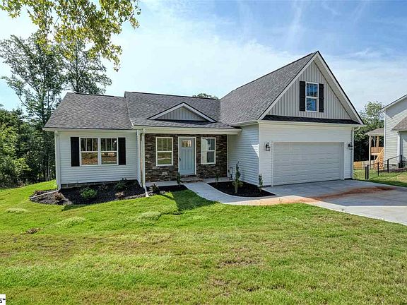 Searching for an oversized homesite that affords privacy? Check out this craftsman ranch with bonus room that is complete and ready to go. Dover white siding with Georgian Gray board&batten accenting the gables completed with black shutters. Grey quartzite stone under the front porch - pull up those rocking chairs and relax! Alpine white cabinets with black pearl granite countertops. Luxury vinyl planks throughout living areas and hallways. Covered deck overlooks private back yard and creek. Beautiful master bath with glass door on separate walk-in shower. 2" white faux blinds to be installed on windows throughout home. No HOA - however, restrictions & covenants to protect your values. Located between Greenville & Spartanburg, this District 5 home can be yours!