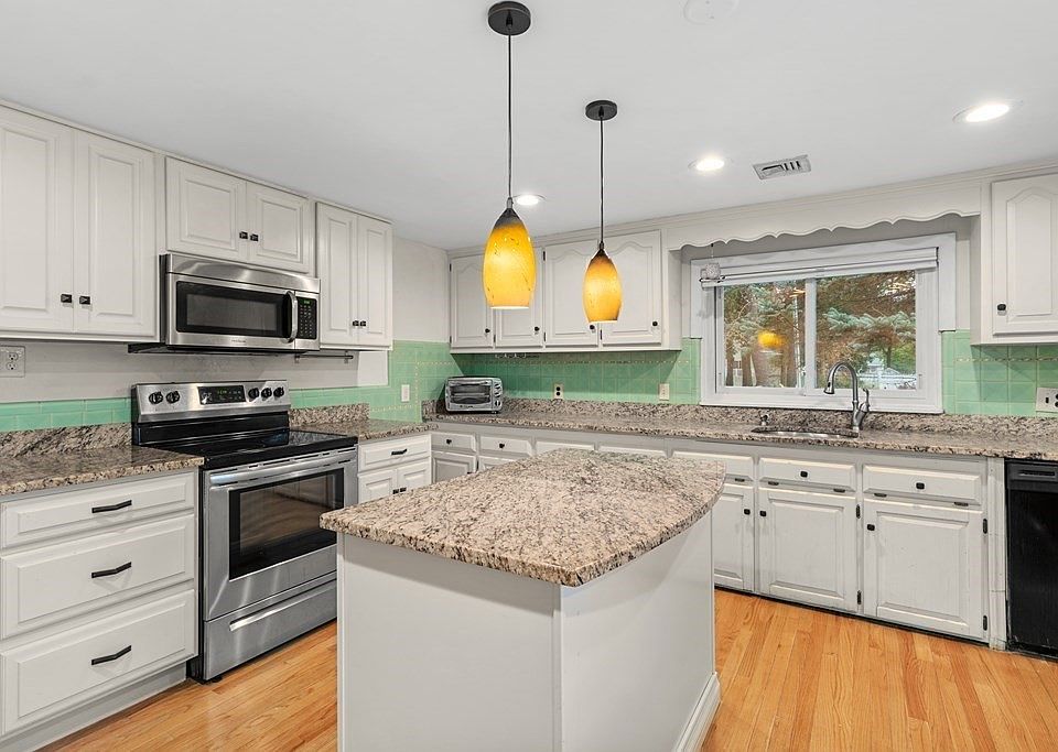 Don't miss this fabulous opportunity in desirable North Wilmington. This home has been lovingly updated over the years and is now ready for its next owner! First floor features gleaming hardwood floors, gracious living room with large windows and enough space to use as dining as well, two spacious bedrooms, a modern bath, and renovated eat-in kitchen with granite counters, island and SS appliances. Finished lower level offers another 1100+ square feet of wide open living space, as well as a full bathroom and two additional finished rooms that could be used for an office, additional bedroom or storage... so many options! Recessed lighting throughout most of home, excellent closet space, central AC, one car garage and a bonus shed. Updates since 2013 include roof, heating, AC, oil tank & much more! Best of all, a backyard made for entertaining with a beautiful stone patio w/ built-in seating and a fire pit. Unbeatable Wilmington location close to 93 for easy access to Boston. Must see!