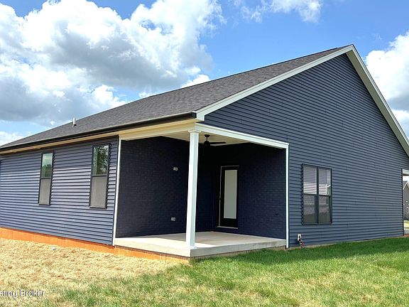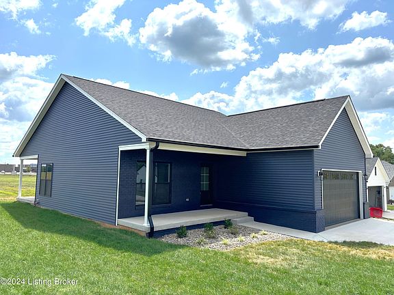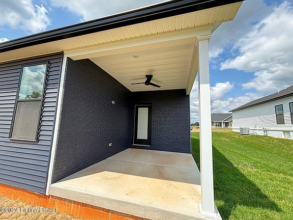 Welcome to this exquisite new construction home in the sought-after Miller Woods Subdivision, nestled on a peaceful cul-de-sac street in Brandenburg, KY. This beautifully constructed residence offers a spacious and thoughtful split floor plan, featuring 3 bedrooms and 2 bathrooms. Step inside to discover 9 ft. ceilings that create a bright and airy atmosphere, with a stunning 10 ft. tray ceiling in the primary bedroom adding a touch of luxury. The primary suite is a true retreat, boasting double sinks, a generous walk-in closet, an extra linen closet, and a custom step-in tiled shower with a sleek glass door. The home's attention to detail is evident throughout, with custom built wood shelving in each closet, a walk-in pantry, untextured ceilings, premium finishes including quartz countertops and subway tile backsplash in the kitchen. The bathrooms feature elegant subway tile shower walls and ceramic tile floors, complemented by premium Delta faucets and Schlage door hardware throughout. Additional features include a tornado storm shelter for peace of mind, a dual fuel HVAC system, and a tankless hot water heater. The covered porches, with their concrete floors and bricked patio walls, offer a perfect setting for outdoor relaxation, while a gas outlet on the back porch adds convenience for grilling. The property also boasts a spacious 2-car garage with an enclosed mechanical room, spray foam insulation for energy efficiency, and freshly sodded yard with professional landscaping and a concrete drive. Enjoy the benefits of city utilities and underground utility lines on this .272-acre lot, all within the vibrant community of Brandenburg. This home combines modern comfort with thoughtful design, making it an ideal choice for those seeking both style and functionality.