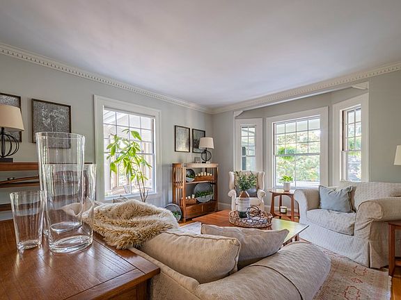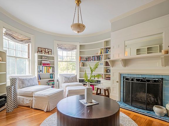 The home you've always dreamed of, a stunning Queen Anne Victorian set on a beautifully landscaped lot in desirable Merriam Hill, meticulously renovated with modern style galore and inviting spaces featuring gleaming hardwood floors, bay windows, and fireplaces. The chef will love the open concept kitchen with high end SS appliances, granite counters, wine chiller, huge breakfast bar island and informal dining. Outdoor living is easy with the front porch, deck, sport court, circular patio, and gardens. The master suite has a light-filled bedroom with fireplace, adjoining exercise room/office and spa-like bath with steam shower and jacuzzi tub. Retreat to the third level perfect as a teen suite with two more bedrooms and a full bath with steam shower. A 2020 renovation created the lower level entertainment haven with a recreation room, wetbar/kitchenette, full bathroom, sauna, and custom built wine cellar. Walk to town center.