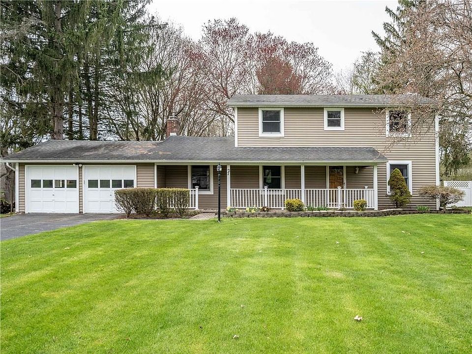 Lovely 4 bedroom colonial on half-acre located on a quiet cul-de-sac street with Pittsford mailing address, Pittsford schools but Perinton taxes. This home boasts hardwood floors throughout, a bright spacious kitchen, dining and family room combo with a cozy wood burning fireplace. Kitchen boasts stainless steel appliances. Large private living room can also be used as an office or easily converted to 1st floor bedroom. Exit the family room from french doors to a large deck that looks out over a private backyard perfect for relaxing or entertaining. New tear-off roof being installed beginning 5/30.