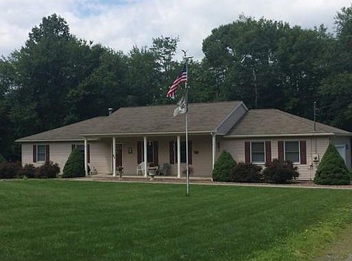 Country Ranch situated on 1.38 Acre Lot bordering Granby, CT line. Open floor plan, cathedral ceilings in living room, huge eat-in kitchen with separate dining area has sliders to deck. Oversized 2 car garage, Large master bedroom has full bath. Newer hardwoods in living room & hallway, Central Air. Covered front porch overlooks large front yard set off road. Shed for additional storage. Don't miss out on this affordable, one level living.