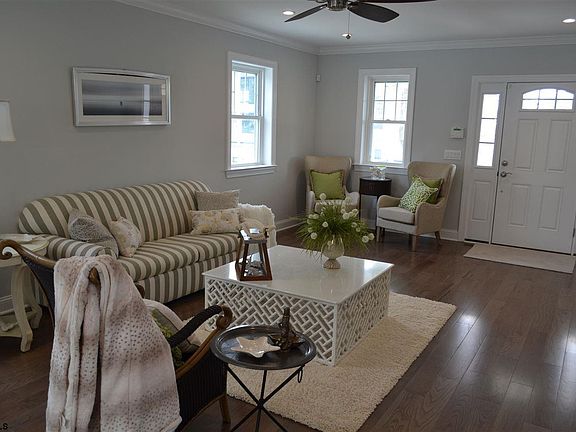 Highly desirable location that everyone wants! Gorgeous must-see new construction built by Mike Richmond Bldr in the heart of Margate's Downbeach section on quiet tree-lined block! Located only 2 blocks to Margate's shopping and dining and only 2.5 blocks to the beach! Features three-story living with large porches on the first and second floors, the large front porch faces the sunsets, a totally maintenance-free exterior with stone accents, an expansive wonderful open floor plan, the first floor bonus flex room can be used as a 6th bedroom for guests and has a full bathroom on this first level, hardwood flooring, custom fully upgraded kitchen with gorgeous countertops and stainless steel appliances, closet outfitted with melamine shelving, a large master suite is on the second floor with a walk-in closet and private deck. There is also located outside an outdoor hot and cold shower, a full yard sprinkler system, a spacious rear yard with paver patio, parking for three cars, and a shed for storage of bikes and beach chairs. The foundation is of pilings and masonry block. The air conditioning system is multi-zoned and with desirable raised ac units. The perfect custom-built luxury new construction home for your family memories at the shore!