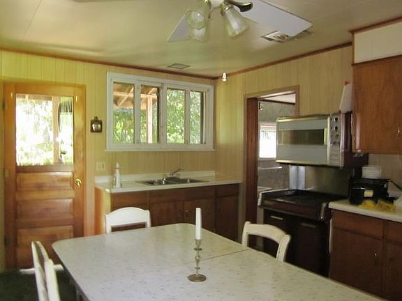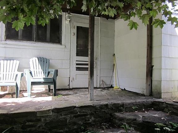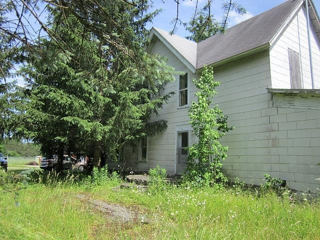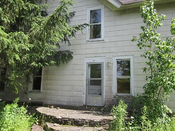 Fixer upper across from school. Two-story home with stone porches, an enclosed porch, first floor bedroom and 3 bedrooms up. First floor has hardwoods throughout (under carpet and according to seller). Eat-in kitchen with built-in pantry. Good storage throughout and cedar lined closets. 8 Acres with 1/2 on house side and 1/2 next to ball field across the road. Lot needs to be cleaned up and bushes & trees cut back to let natural light into the large living room windows! There is a pond but due to high grass & cattails, pictures not possible. Cash or rehab loan. Not sure furnace works.