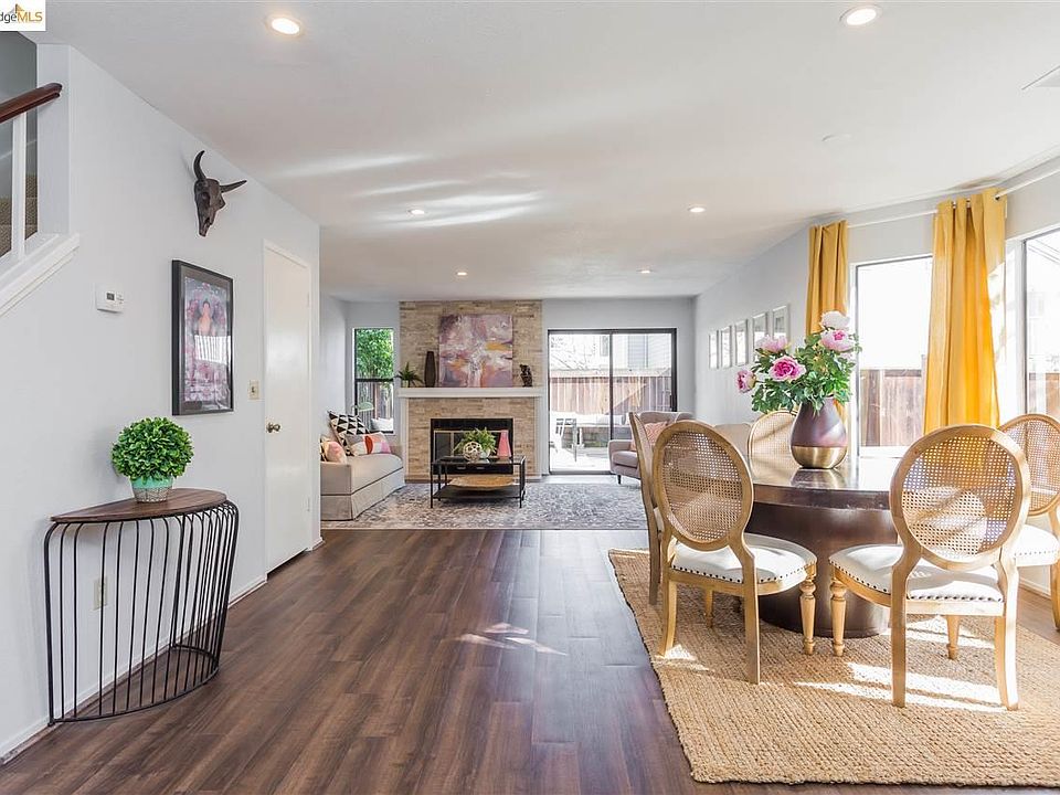 Tastefully elegant updates compliment the smart layout of this three bedroom, two and a half bathroom Brittany Bay townhouse with two car side-by-side garage. Recent top to bottom updates including fresh paint, engineered wood flooring, kitchen appliances, carpet, bathrooms, and recessed lighting. The main level's bright, open floor plan is ideal for entertaining with an eat-in kitchen, dining area, living area with fireplace, and sliding glass doors leading to an expansive fenced outdoor area. Three spacious bedrooms include a master suite with an exposed beam vaulted ceiling, en suite bath, and a charming balcony. The gated community features include a pool, spa, and community center. This is an immaculately maintained townhouse with a detached house feel that will quickly and surely become home.